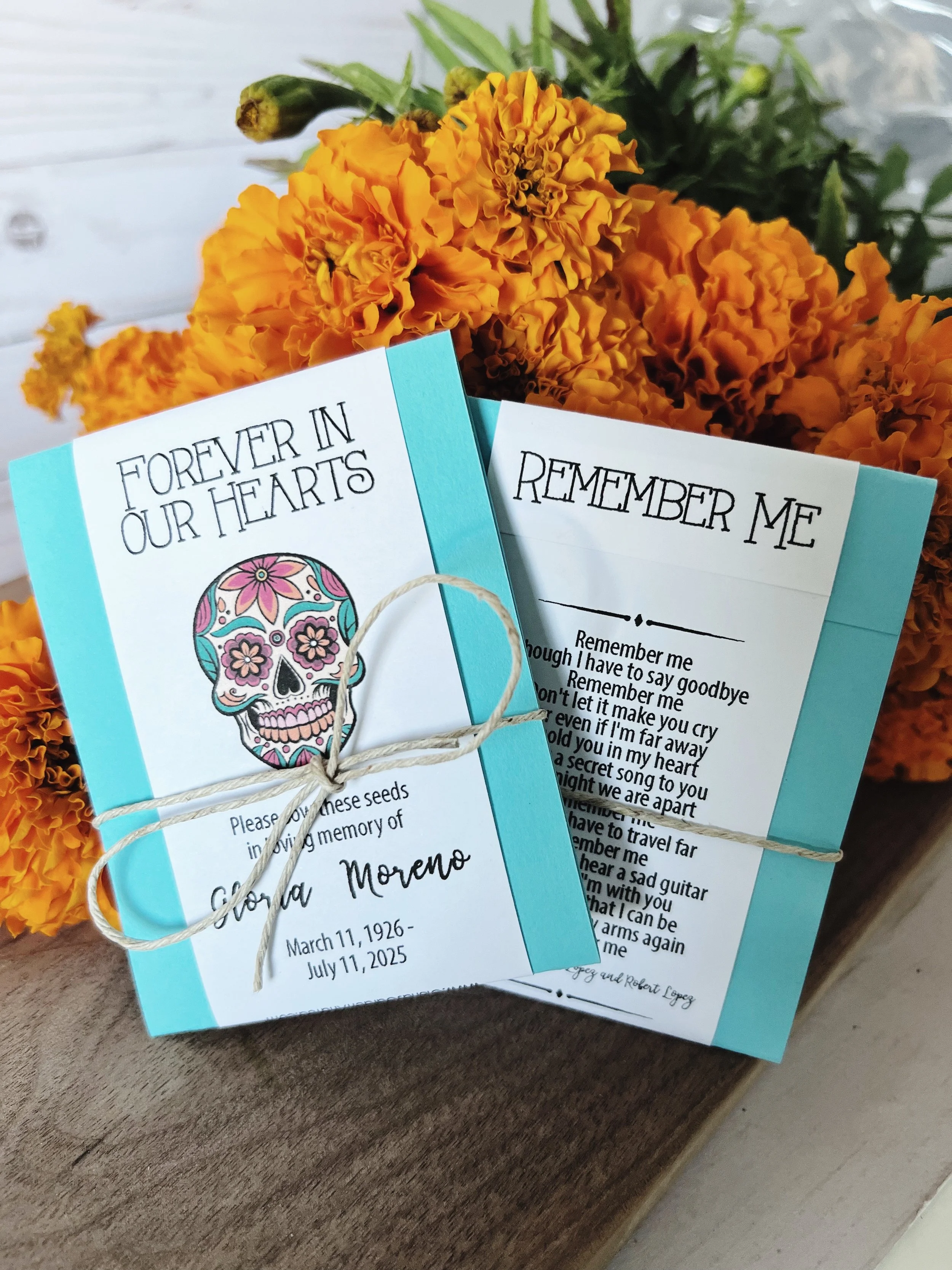 Each packet can be personalized with your loved one’s name or a special message, creating a heartfelt keepsake for friends and family. As the marigolds grow and bloom, they serve as a living reminder that love never truly fades — it simply grows in new ways.