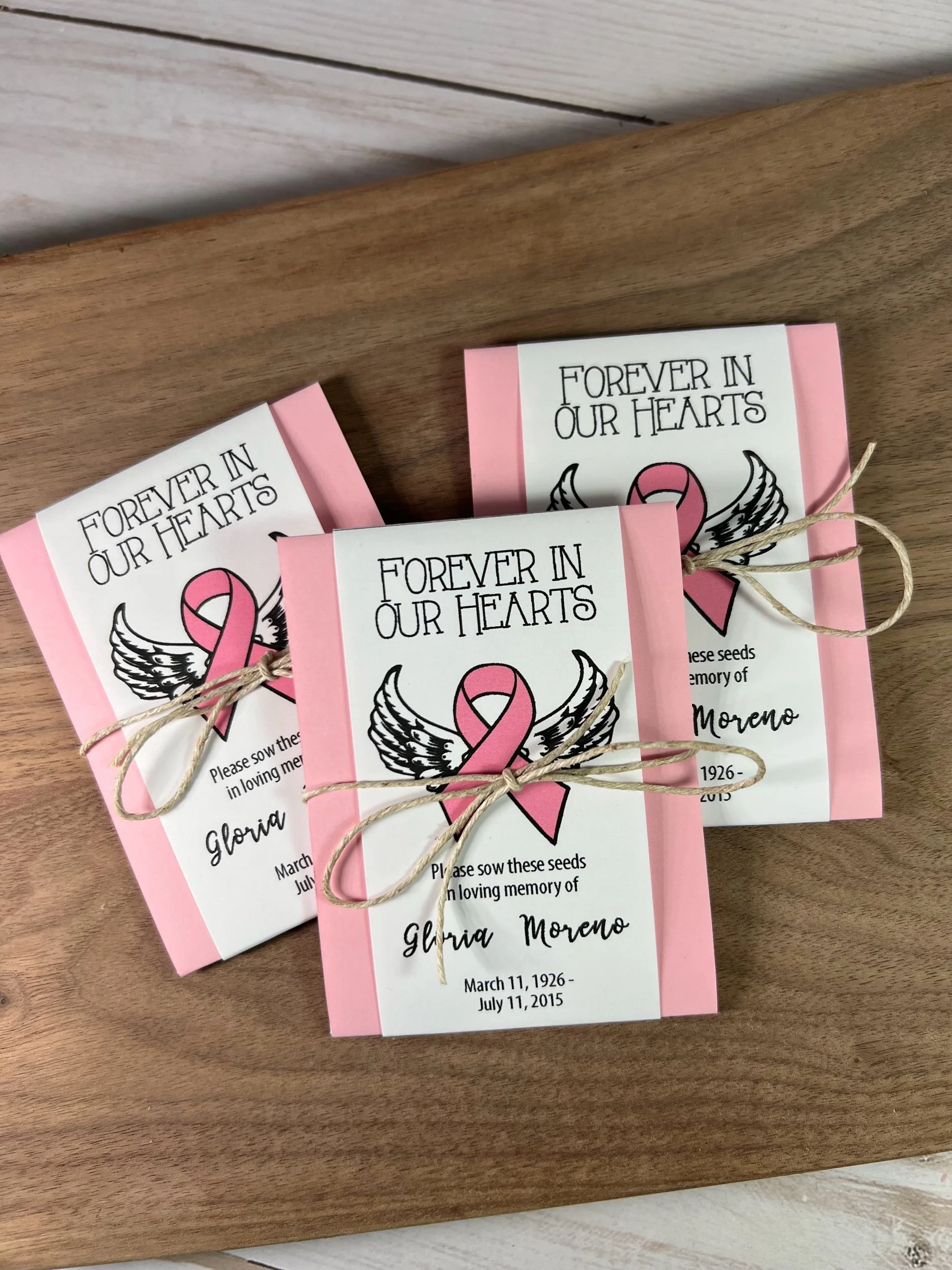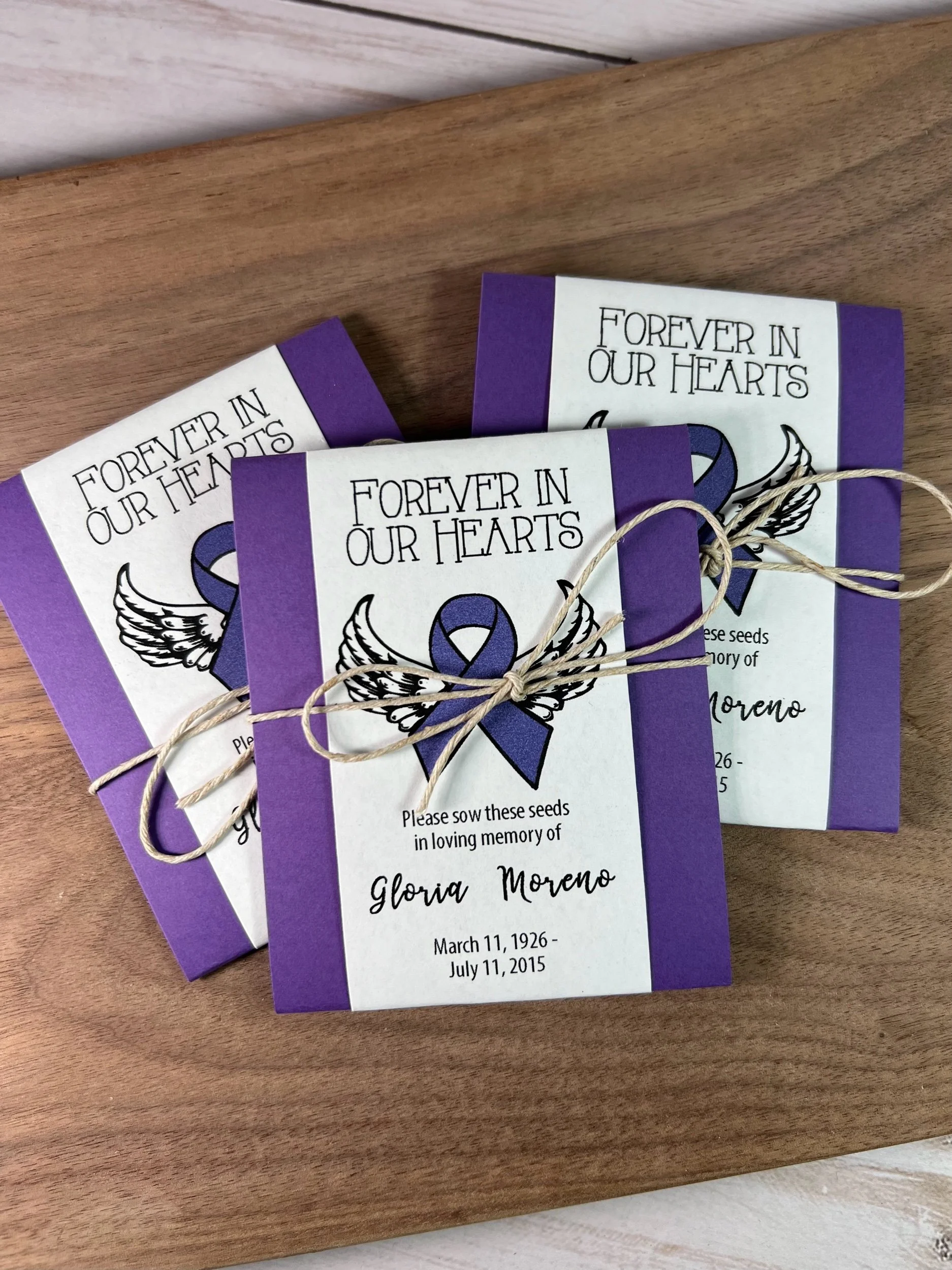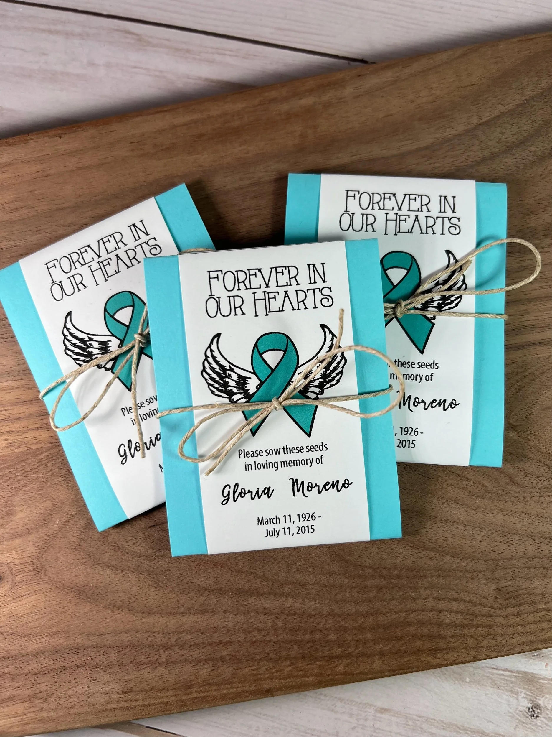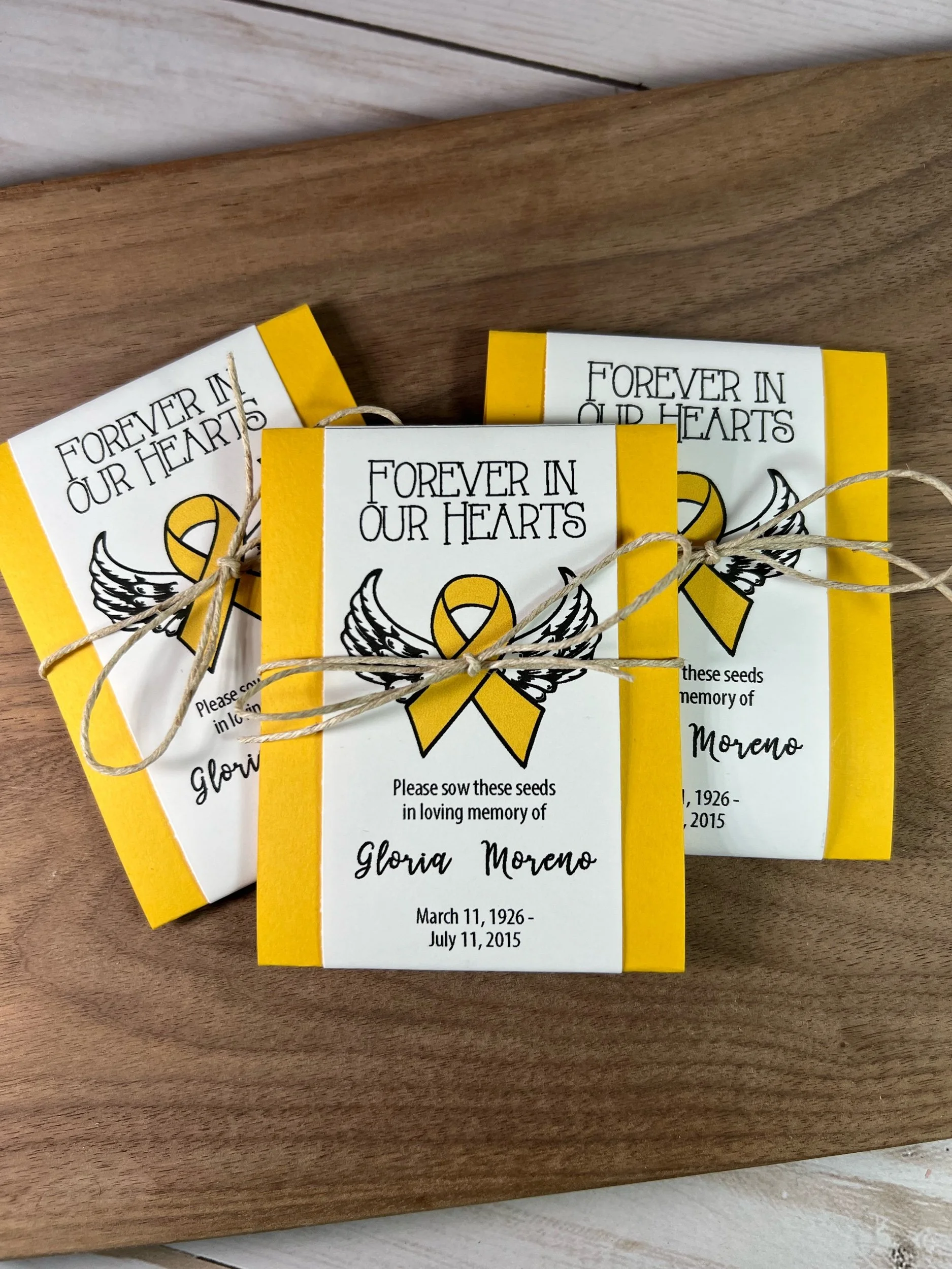 Each seed packet is personalized with your loved one’s name and dates (or organization).