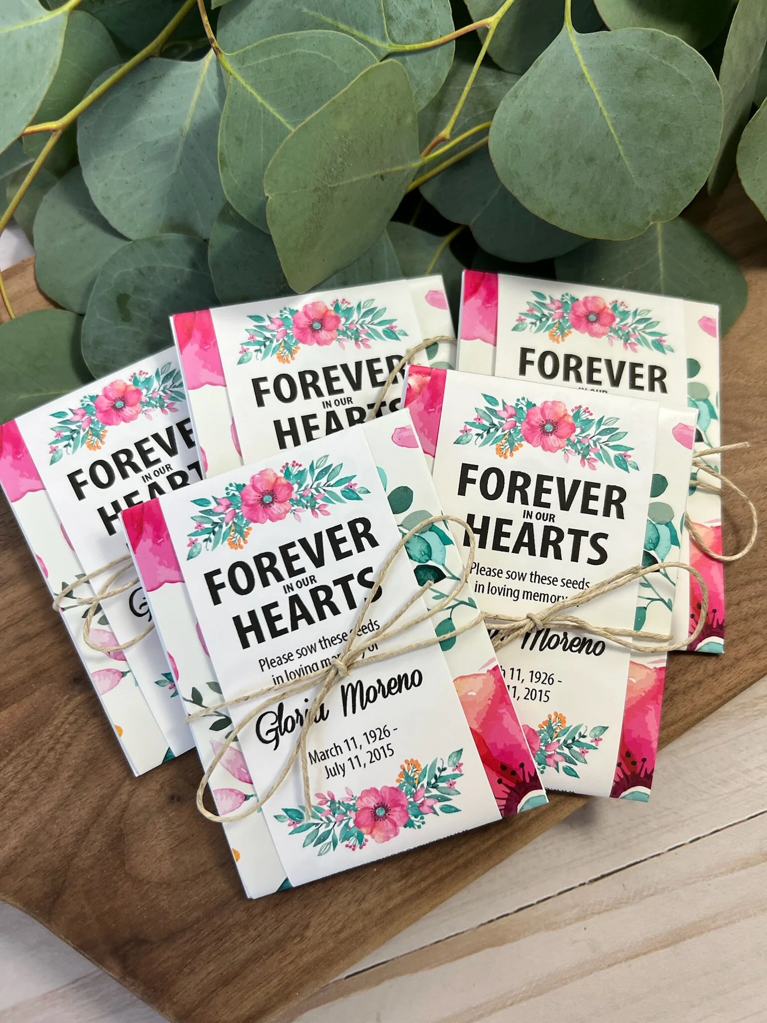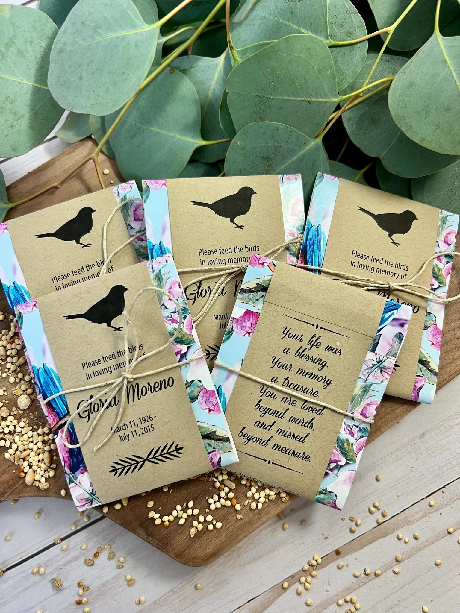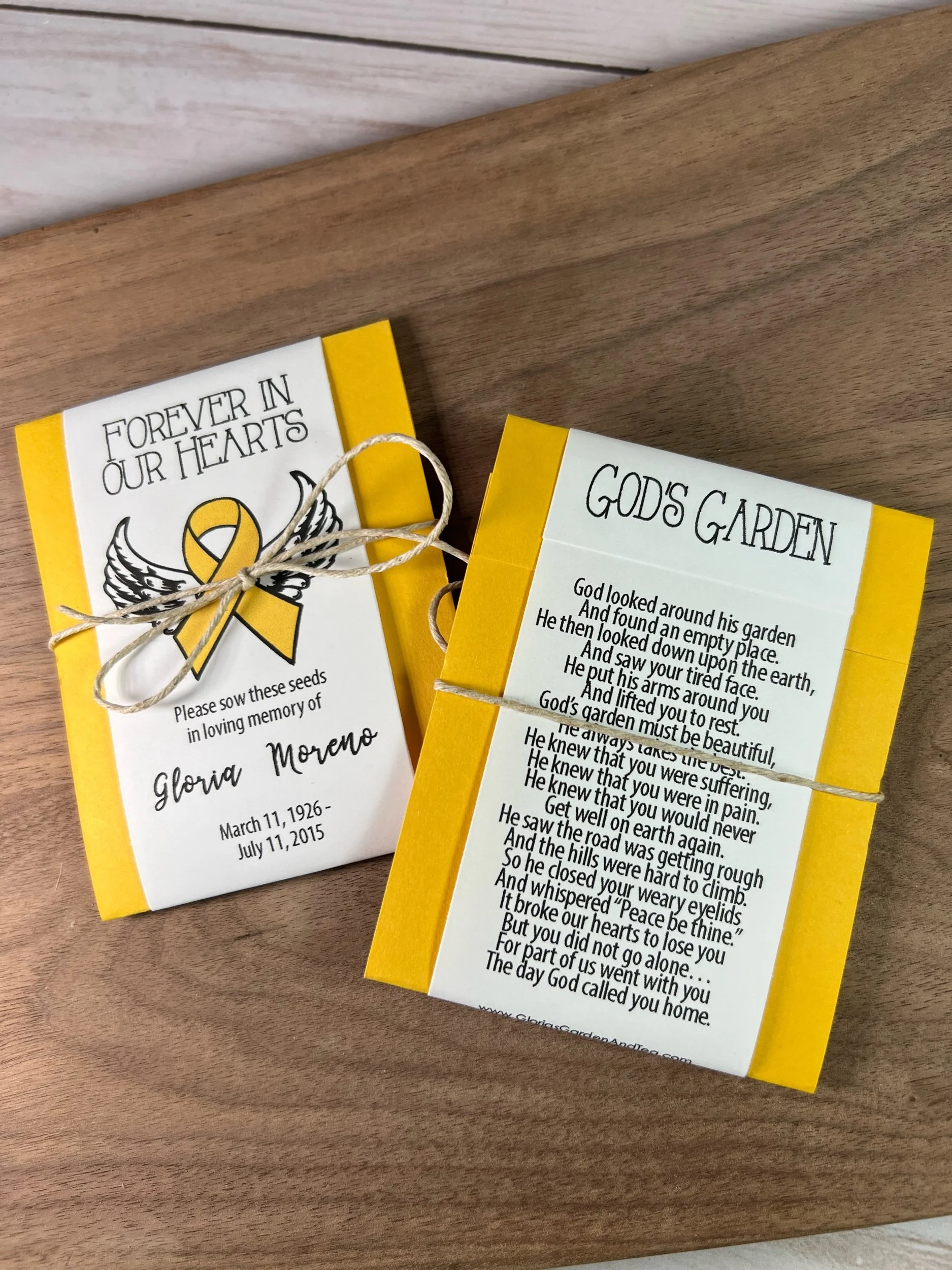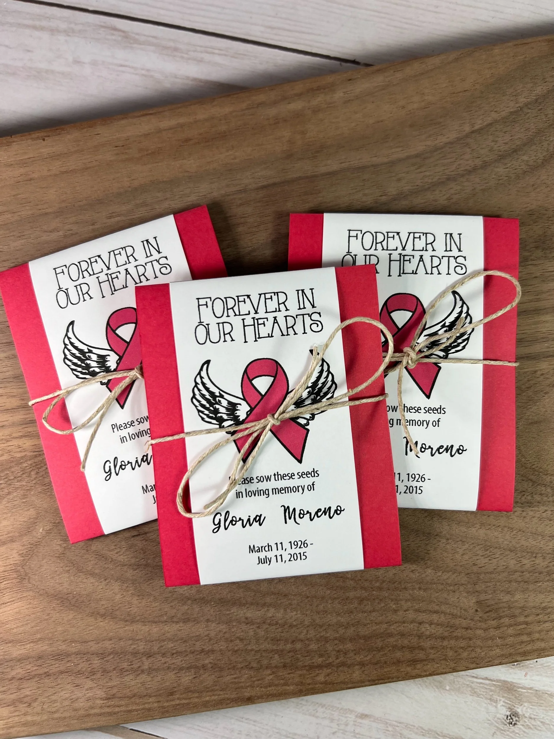 Each seed packet is personalized with your loved one’s name and dates (or organization).