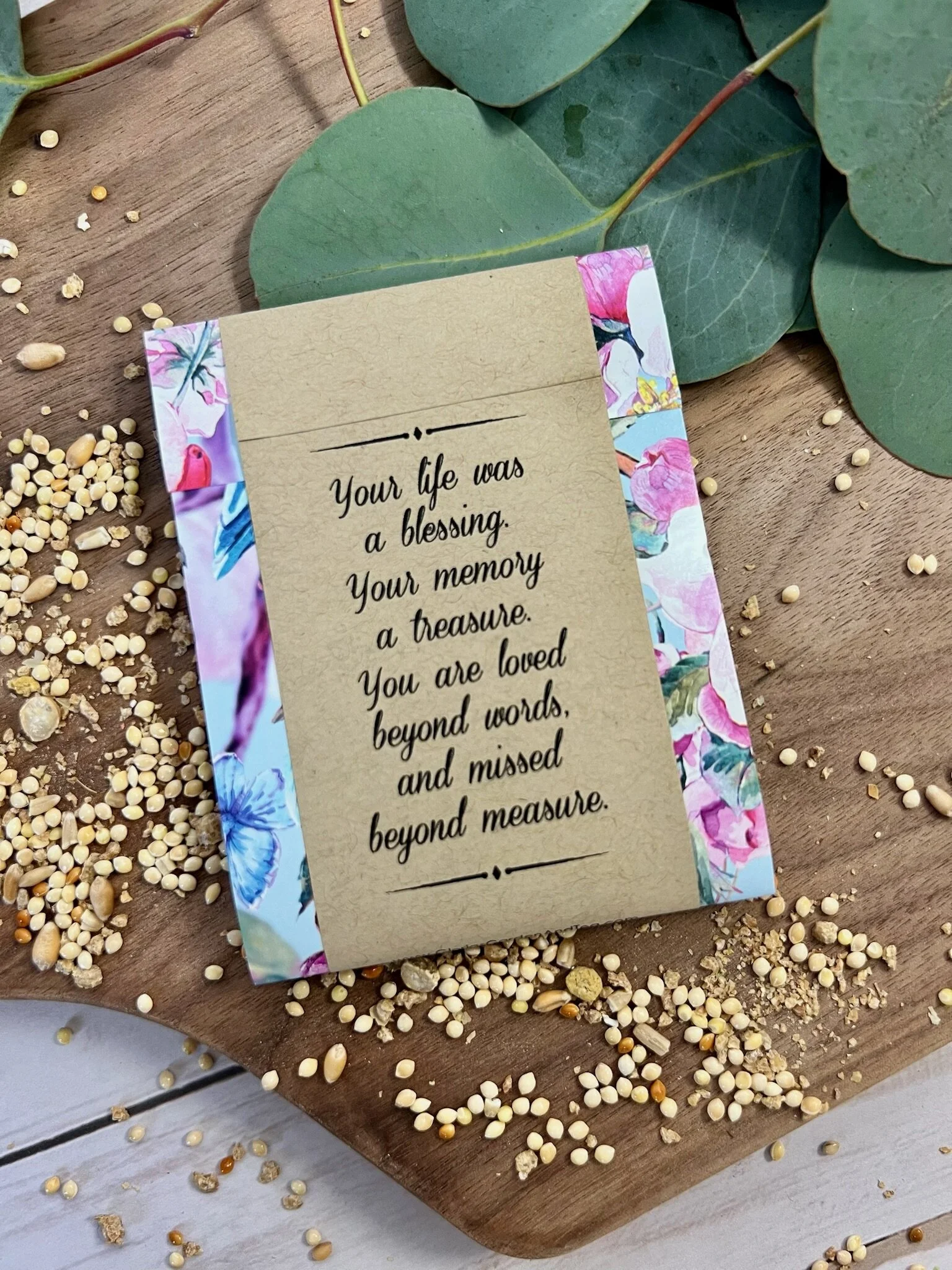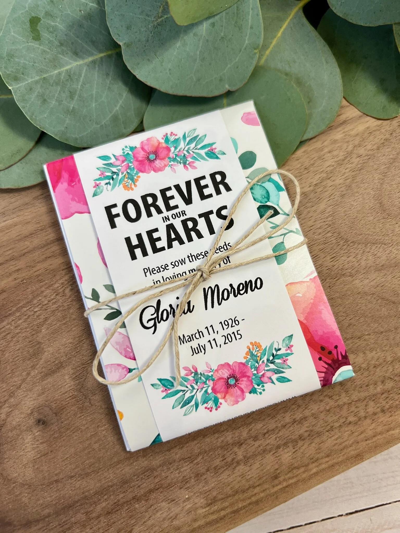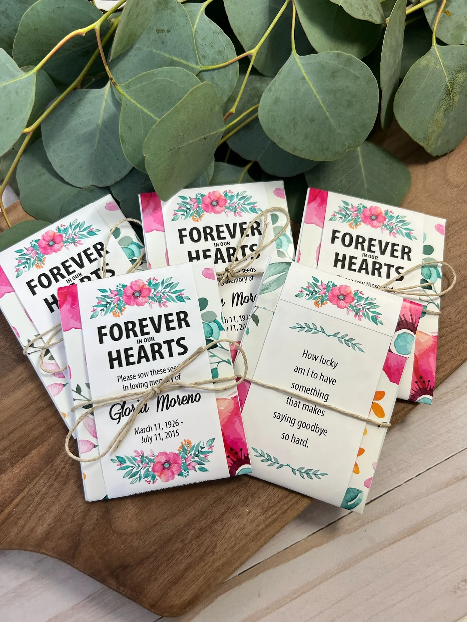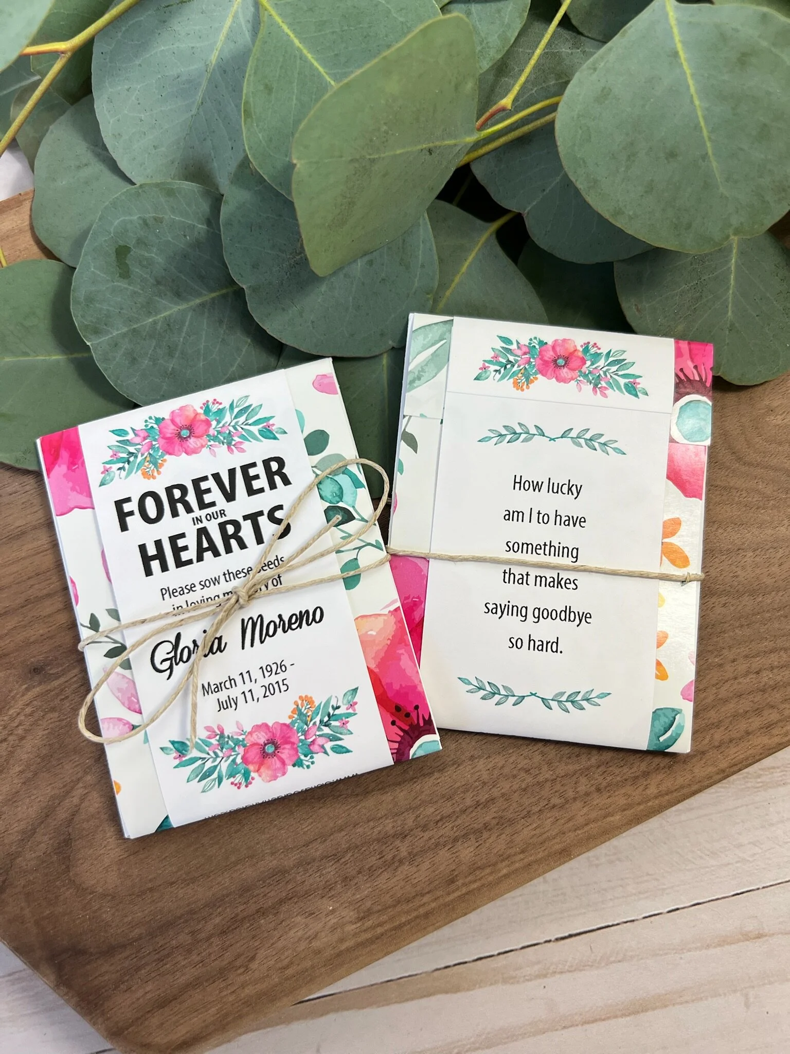 Each seed packet is personalized with your loved one’s name and dates (or organization).