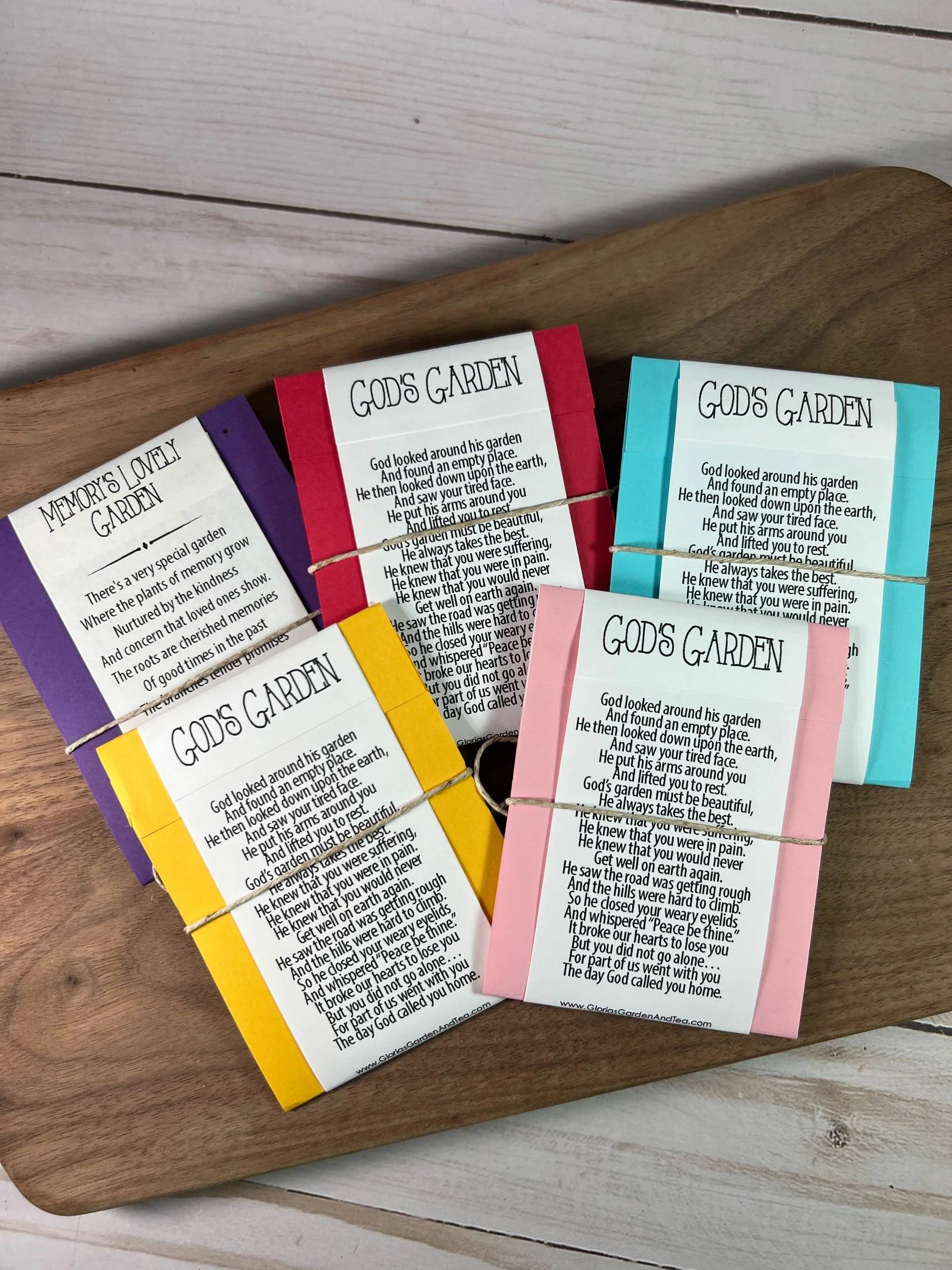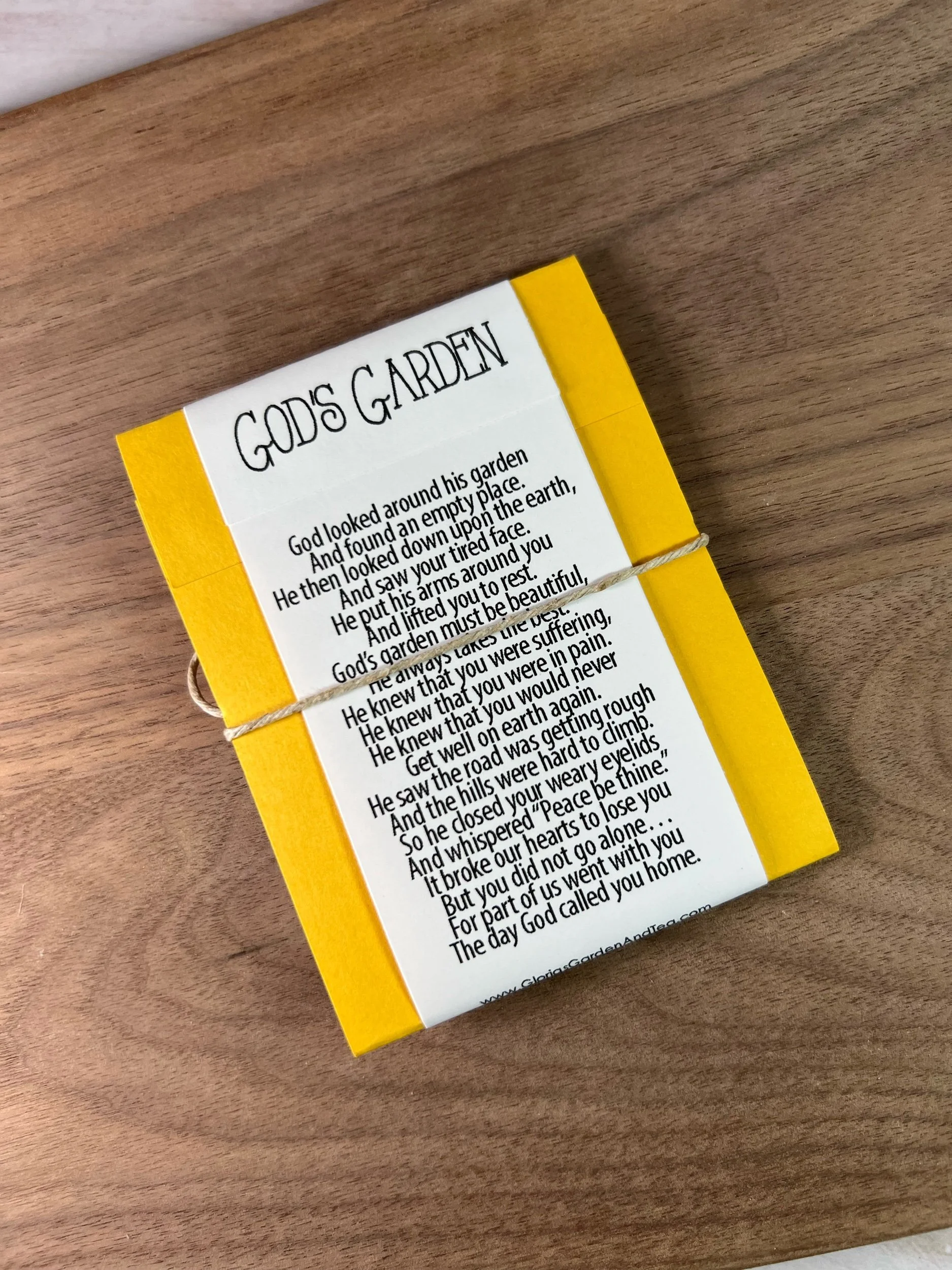 Features the poem “God’s Garden” (author unknown) on the back.