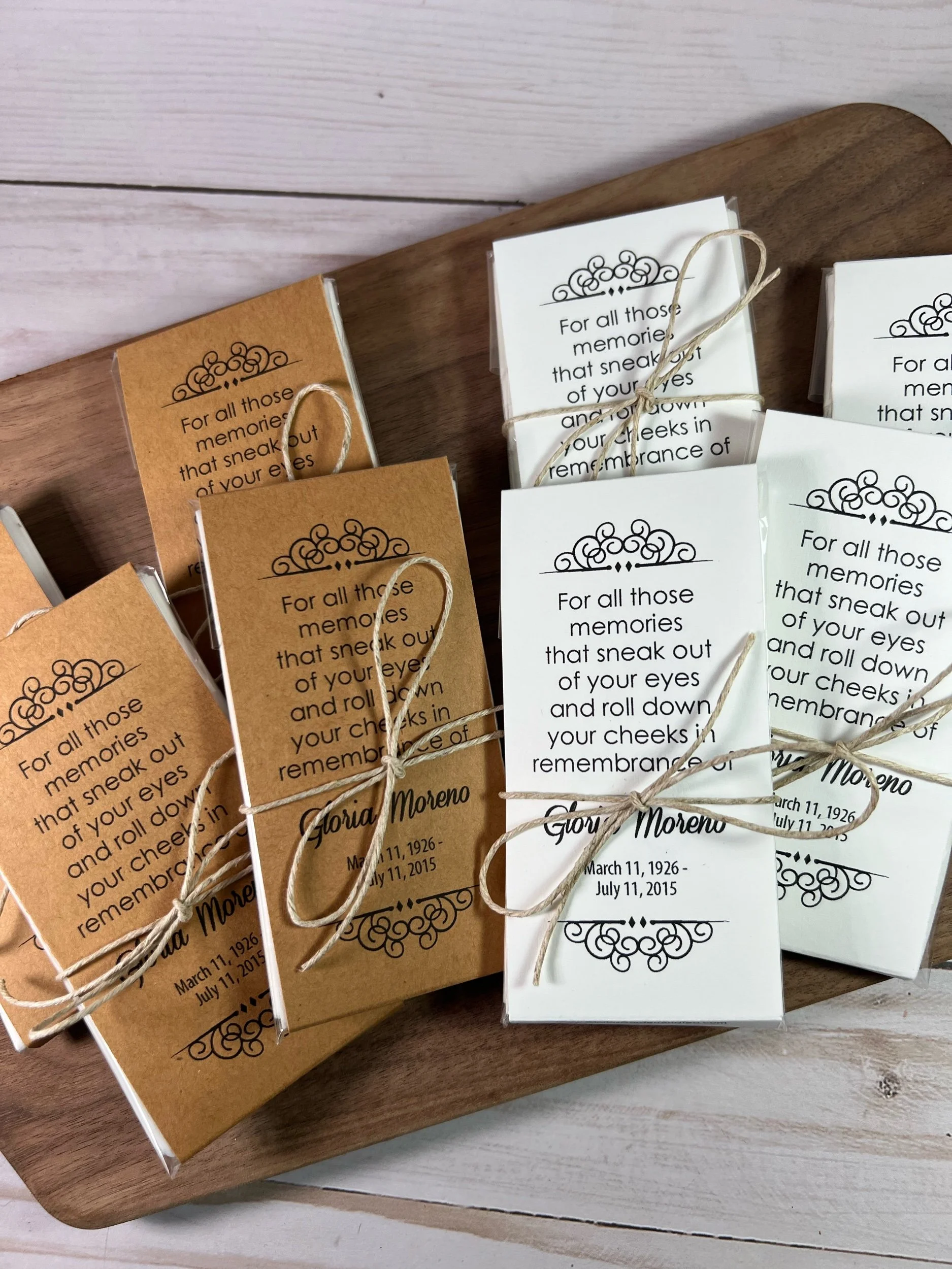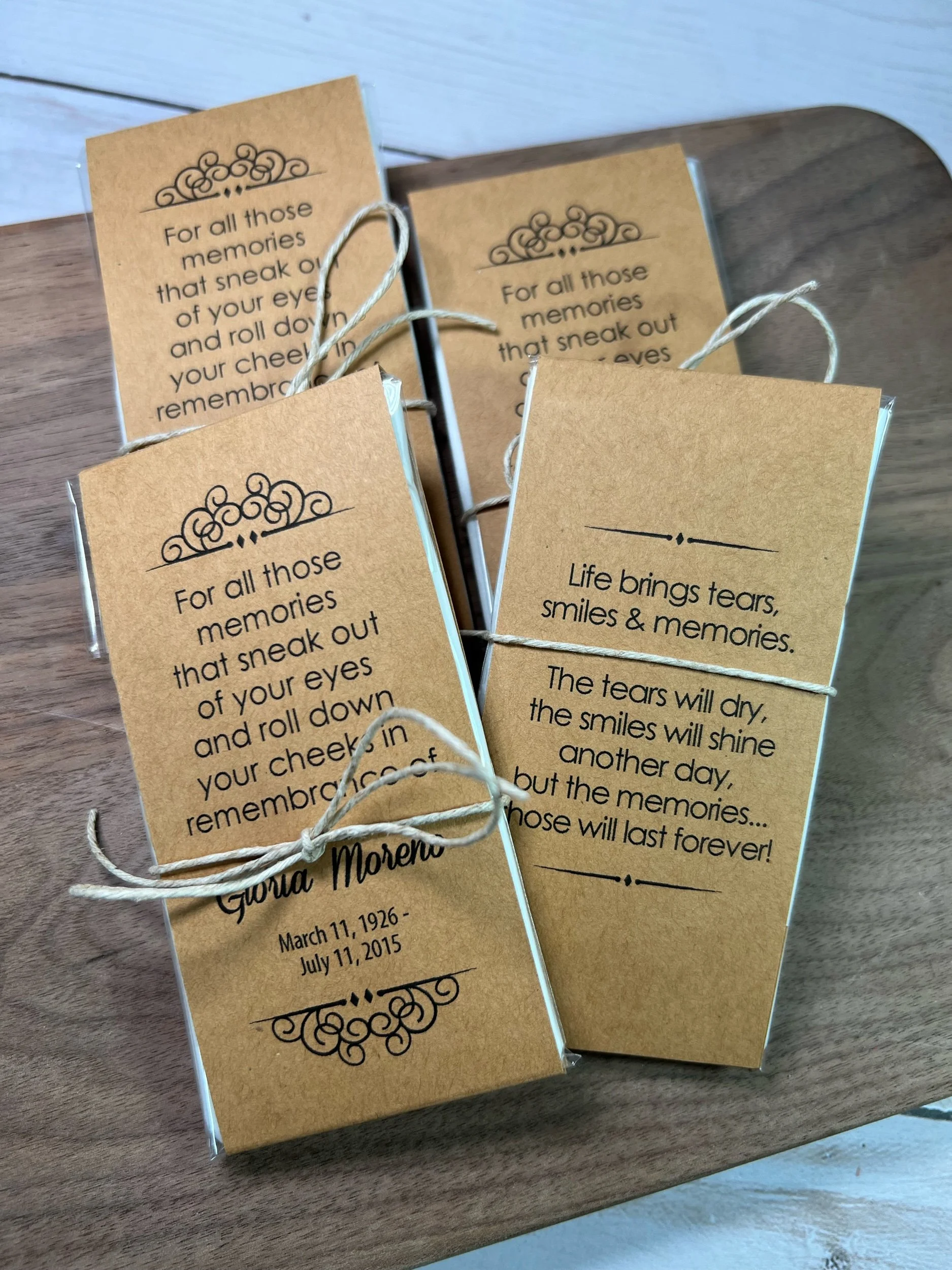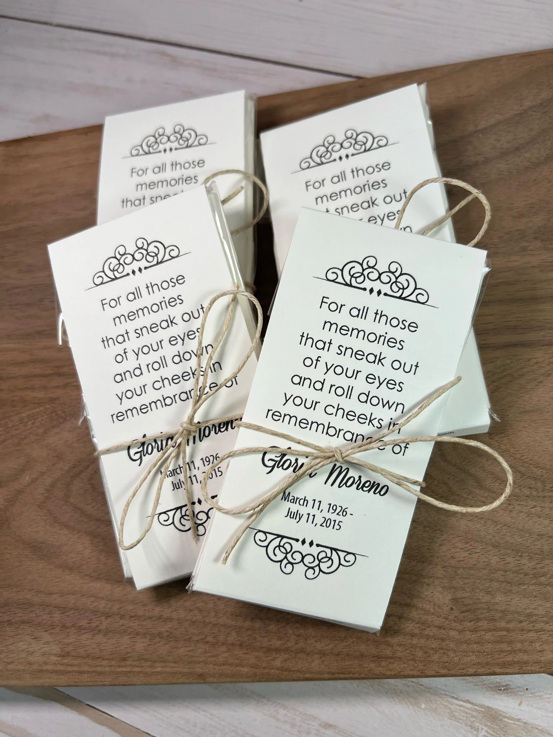 Categories: All Seed Packets Memorials Weddings Baby Showers Gifts & Other Tea & Tissue Packets Tea Packets Tissue Packets Gift Sets Order Adjustments All / Tea & Tissue Packets / All Seed Packets Tea & Tissue Packets Tea Packets Tissue Packets Gift Sets Order Adjustments Personalized Memorial Tissue Packets | Funeral & Celebration of Life Favors | Keepsake Guest Gift for Loved Ones from $13.60 View Options