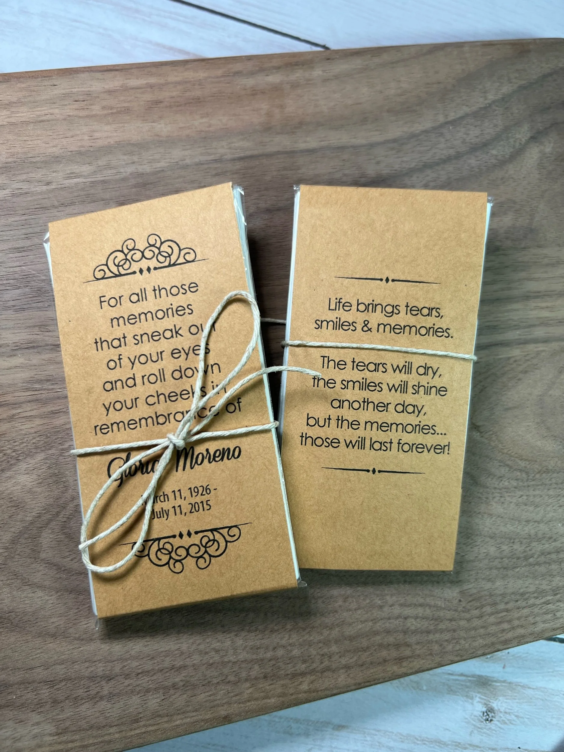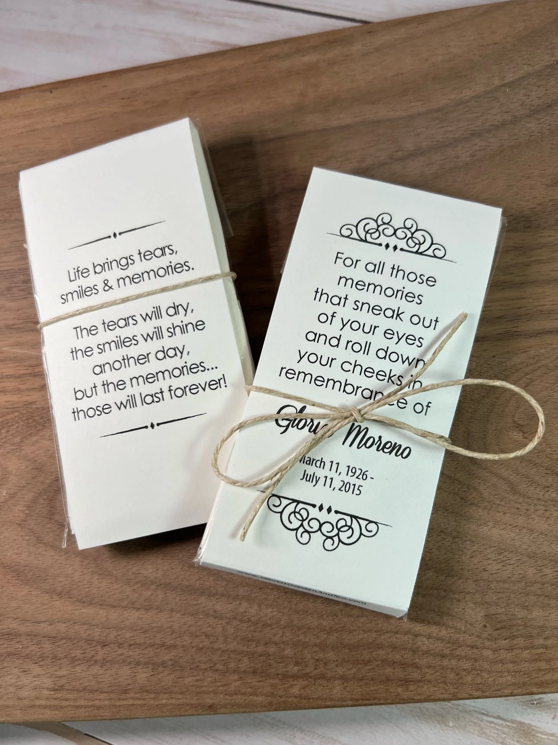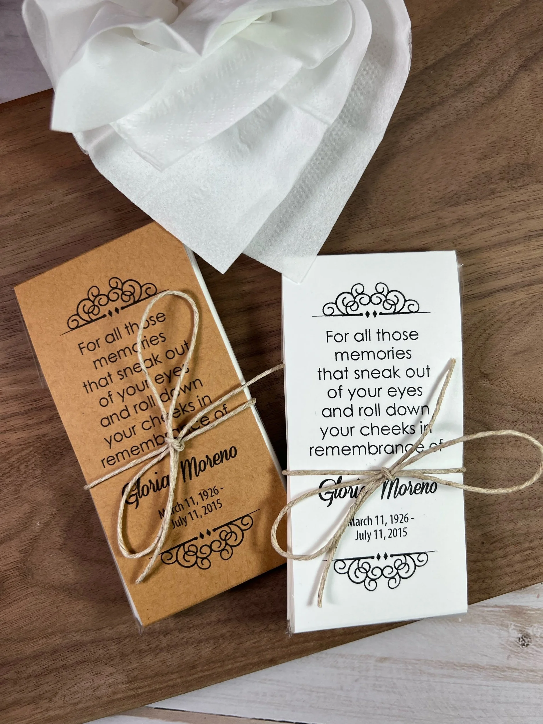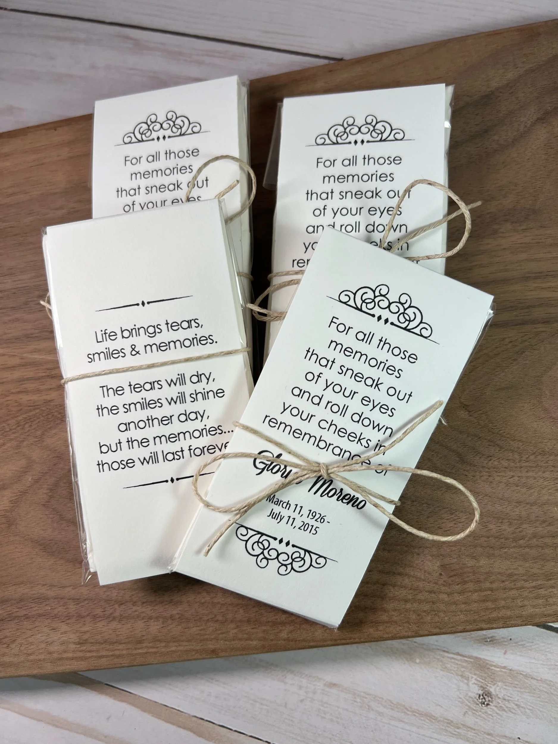Categories: All Seed Packets Memorials Weddings Baby Showers Gifts & Other Tea & Tissue Packets Tea Packets Tissue Packets Gift Sets Order Adjustments All / Tea & Tissue Packets / All Seed Packets Tea & Tissue Packets Tea Packets Tissue Packets Gift Sets Order Adjustments Personalized Memorial Tissue Packets | Funeral & Celebration of Life Favors | Keepsake Guest Gift for Loved Ones from $13.60 View Options